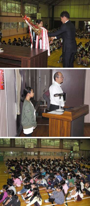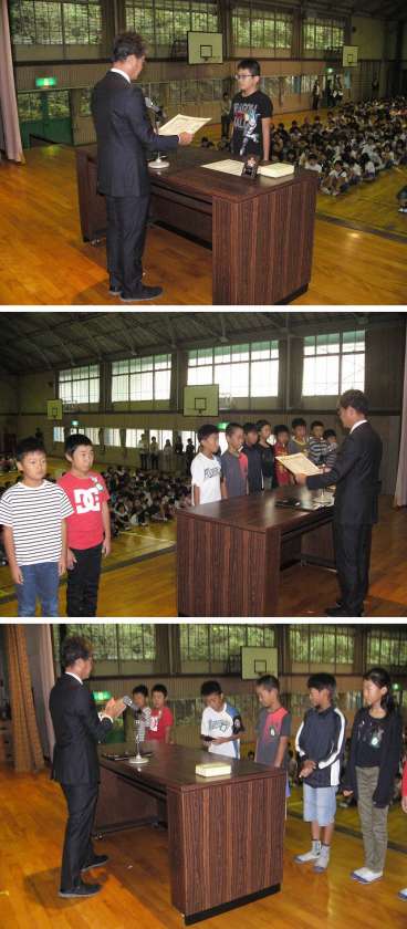 今日の朝会では、赤い羽根作品募集の入選と坂下軟式野球スポーツ少年団の新人大会入賞の表彰を行いました。それぞれ素晴らしいがんばりでした。おめでとうございます。また、運動会当日できなかった白組優勝の表彰も行いました。伝統の大トロフィーを白組応援団長さんに渡すことができました。おめでとうございました。