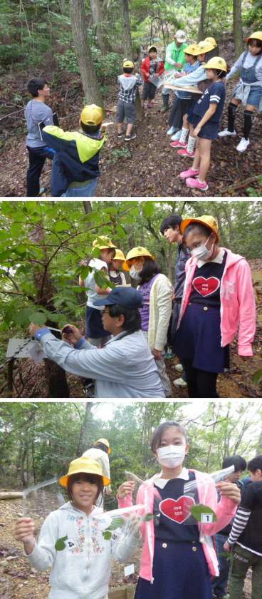 今日は「みどりのまちづくりグループ」の方を講師としてお招きし、自然観察林の木の名前などを調査しました。葉を集めたり、幹の太さを測ったりしました。