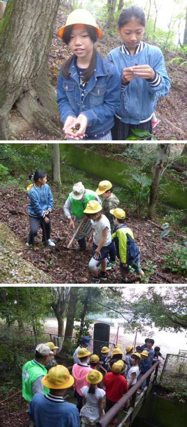 自然観察林の自然を守っていくために、ドングリを集めて、台風で木が倒れてしまったところに埋めました。自然の力で10年後に大きな木になっているといいですね。自然ふれあいクラブの皆さんが坂下小学校の自然を守ってくれると、全校の皆さんにも伝わって、みんなで自然を大切にしてくれると思います。
