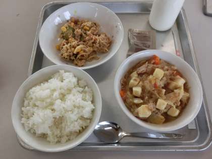10月17日(水)の献立は『ご飯』『牛乳』『豆腐の中華飯』『切り干し大根とツナのサラダ』『ココアパウダー』です。