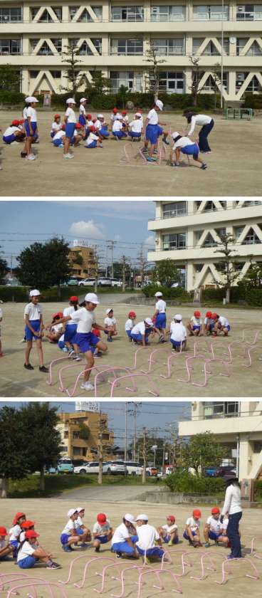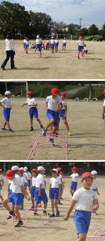 器具を使って、俊敏に動く運動をしました。ハードルやジャンプの時に役立つ運動ですね。