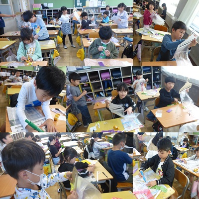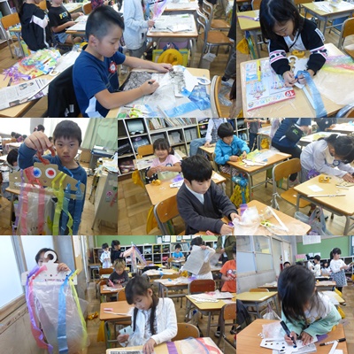 図画工作「ひらひら ゆれて」の授業を行いました。風に揺れるかざりを考え、カラーテープや紙テープやひも、折り紙などを用いて、作りました。材料を風に揺らしながら、どんなものを作ろうか考え、いろいろな材料を使って表すことができました。最後には、友達と作品を風に揺らして見せ合い楽しむ姿がありました。