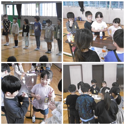 生活科の学習で、おもちゃまつりをしました。どの子も1年生に優しくおもちゃの作り方や遊び方を説明して、一緒におもちゃを作りました。1年生も2年生も笑顔いっぱいでした。まつりの後に1年生から「楽しかったです。」と言ってもらえてよかったですね。