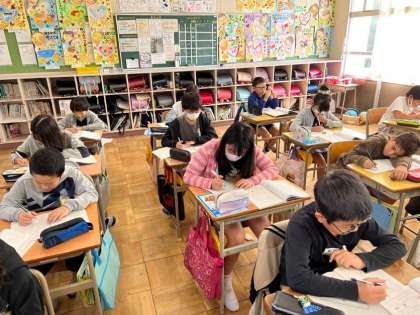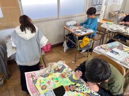 1組は図工の学習です。野外学習の前から進めてきた読書感想画の完成が近づいてきました。納得のいく作品ができるように、仕上げまで頑張っています。