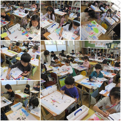 図工の学習では、乗ってみたい乗り物や行ってみたい場所を自由な発想で描きました。最後に絵の具で背景を着色して完成しました。