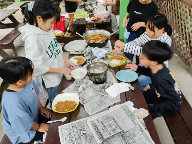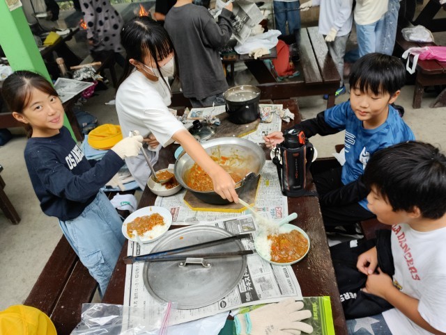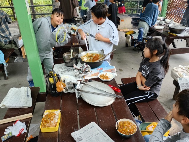 カレーと御飯が出来ました。みんなで作ってみんなで食べるとおいしいですね。