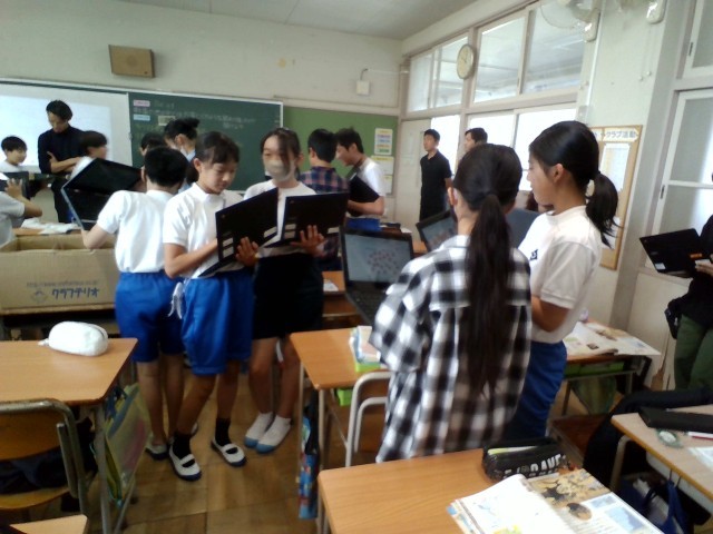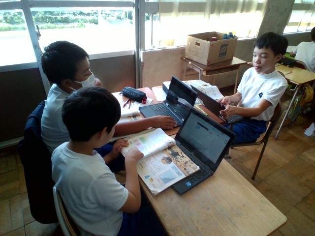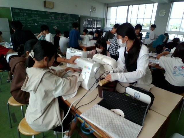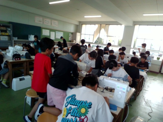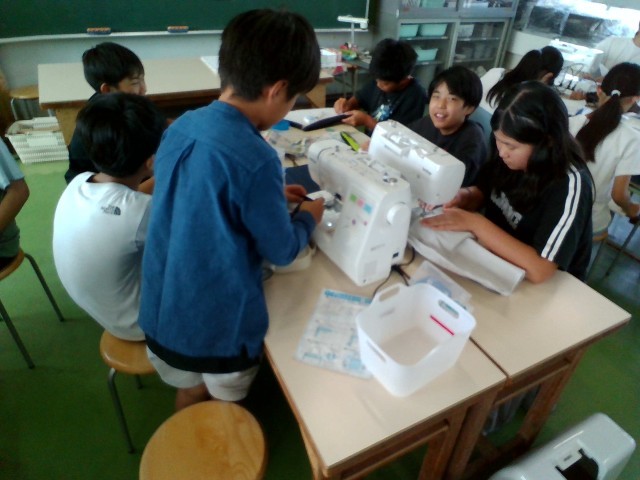 社会では、「戦国の世から天下統一へ」の学習をしています。戦国の世の中では、外国とどのような関わりがあったのか調べたことをまとめました。家庭科では、袋作りをしています。ミシンを使って慎重に縫っていました。