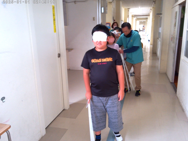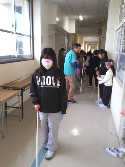 実際に目の不自由な人を案内する練習をしたり、目を隠した状態で白杖を使ったりすることで視覚障がいのある人への理解を深めました。