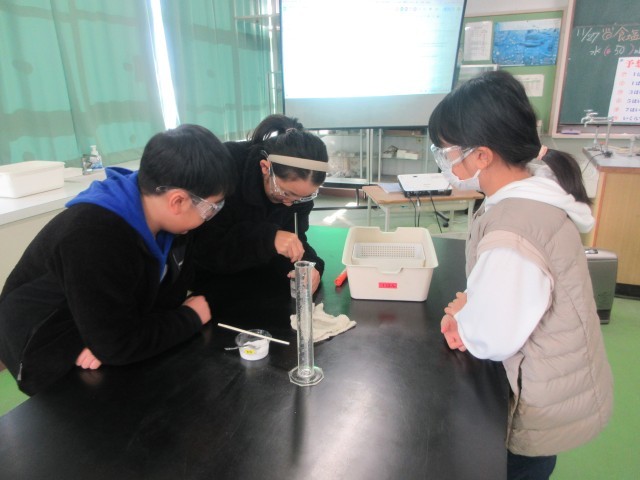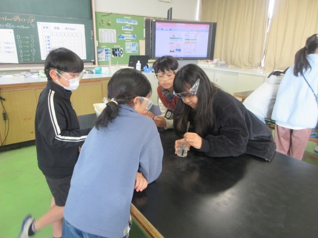 理科では、「物のとけ方」の学習をしています。ミョウバンの実験をしたことをもとに、塩がどのようにとけるか予想を立てました。自分の予想を友達と伝え合い、予想を変えたり自分の考えを深めたりしていました。班で協力してテキパキと実験に取り組んでいました。
