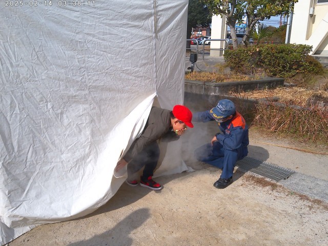消防署の方を講師としてお招きして、煙道体験をしました。火事になってときの煙がたくさんある中での避難のしかたを教えてもらいました。煙の中では、姿勢を低くし、煙を吸わないようにハンカチで口を覆ったり、壁づたいに歩くことが重要だということを子どもたちは実感していました。