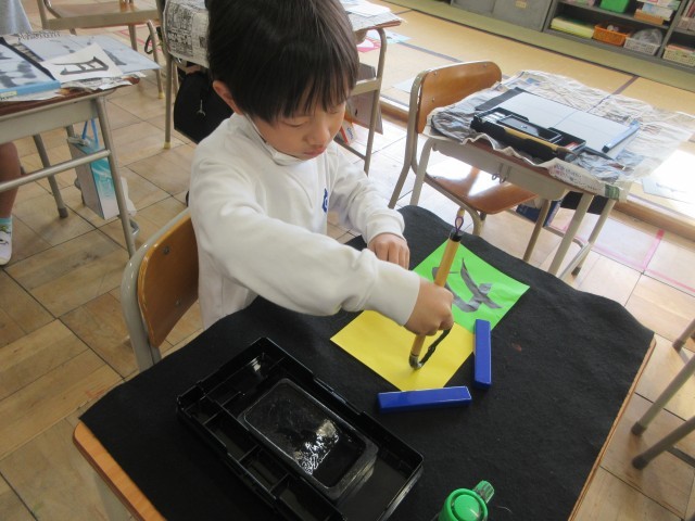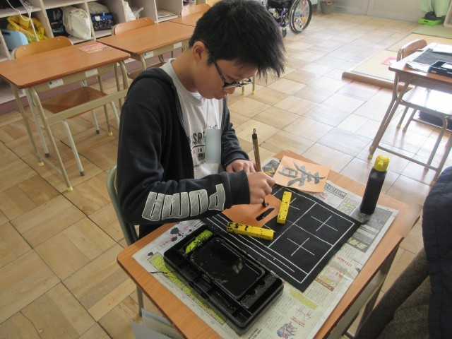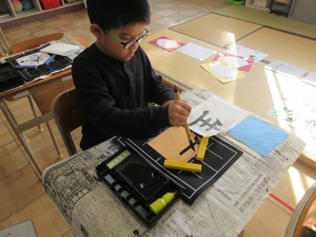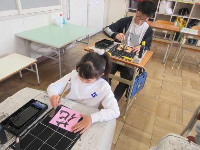 書写では、自分が選んだ文字を書きました。筆のはらいや、とめに気を付けてかきました。とても真剣に取り組み、立派な字が書けました。