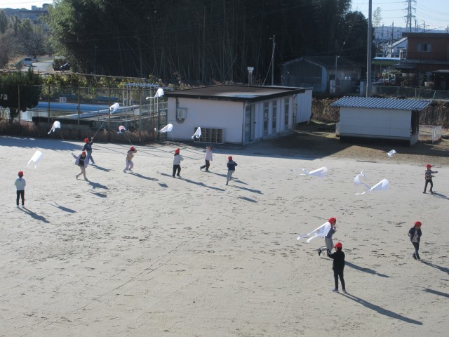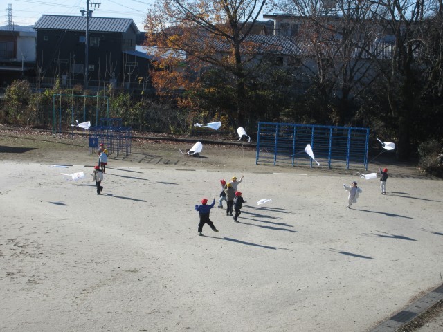 生活科の「ふゆをたのしもう」の学習で、凧揚げをしました。冬らしい北風が吹いていたので、凧がよく揚がりました。楽しそうに夢中になって遊んでいました。