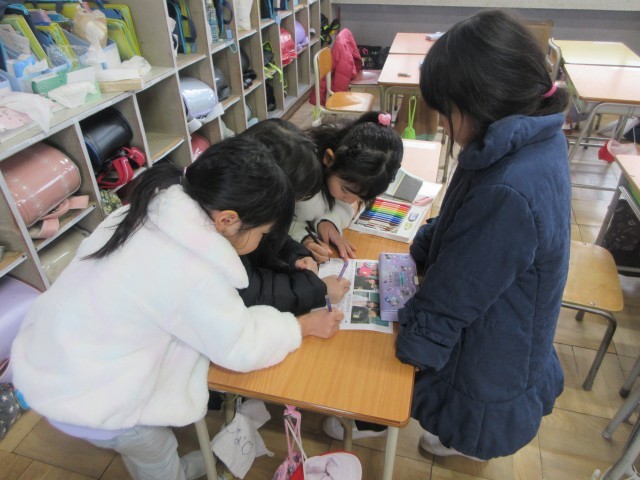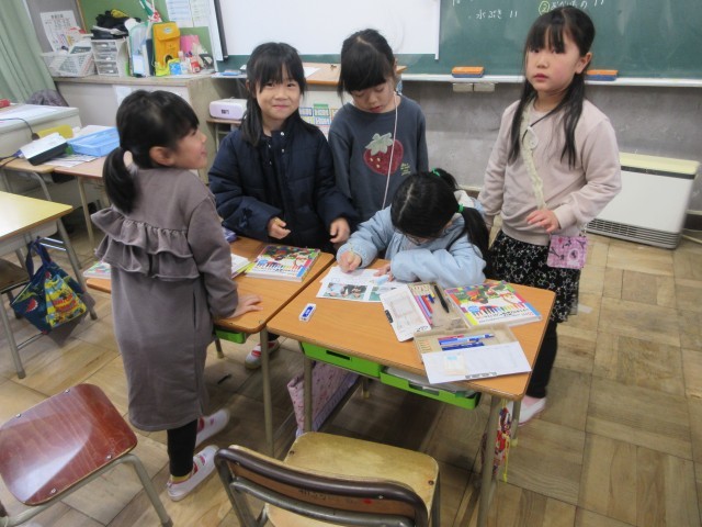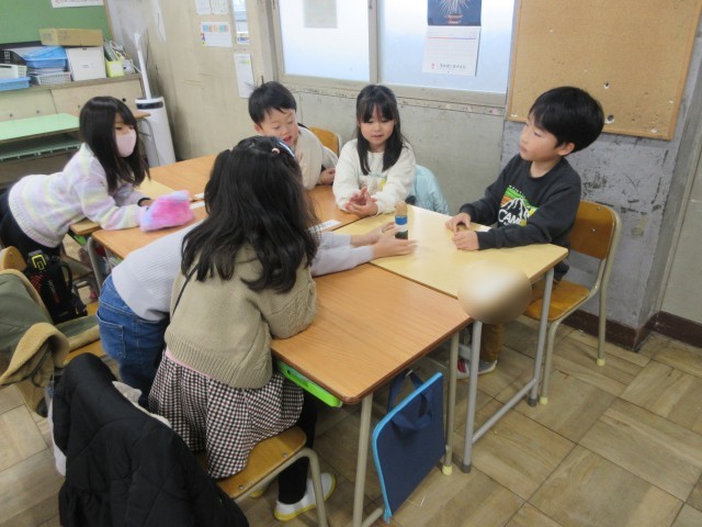 生活科では、「ふゆをたのしもう」の学習をしました。班で「だるまおとし」をしました。みんな、ドキドキしながら挑戦していました。学級活動では、3学期の係カードを作りました。友達と一緒に仕事の内容を確認しました。