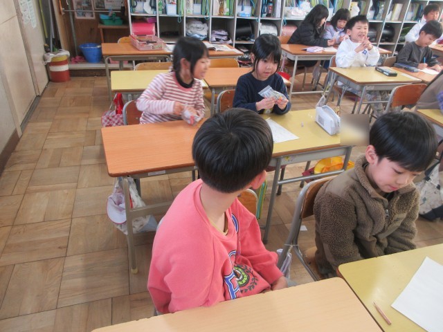 国語では、「どうぶつの赤ちゃん」の学習をしました。自分が調べた動物の赤ちゃんについて、絵と文章でまとめました。算数では、「大きいかず」の学習をしました。お金の教材を使って、買い物学習を通して数の大きさを確認しました。