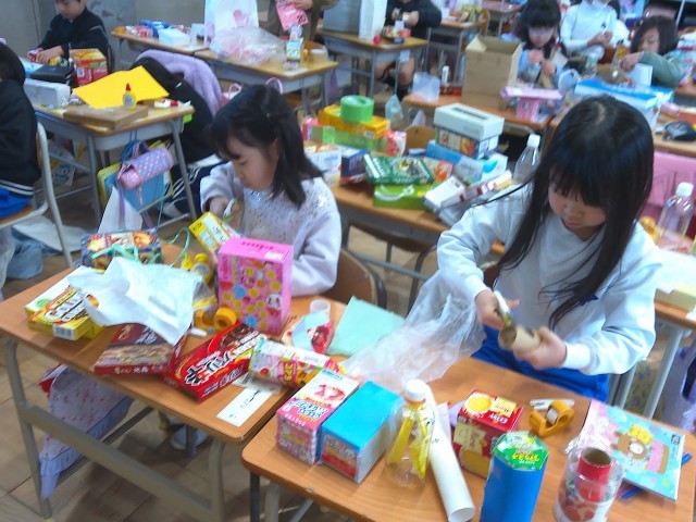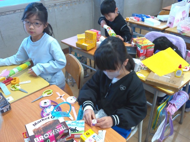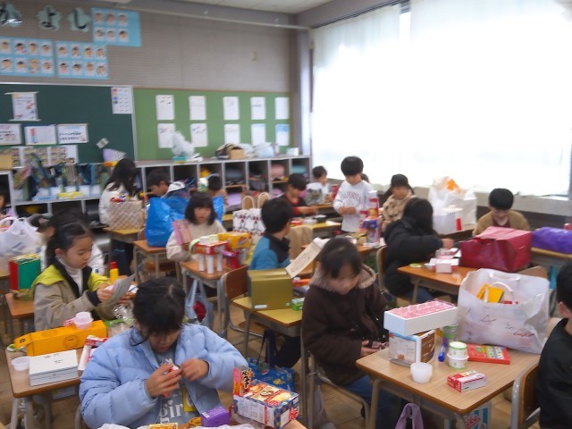 図画工作科「はこでつくったよ」の学習で、先週に引き続き作品作りに取り組みました。箱を積んだり並べたりしながら表したいことを考え、恐竜やロボット、動物など思い思いの作品を作りました。