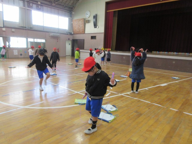 体育では、「跳び箱」と「縄跳び」をしました。跳び箱では手の付き方に気を付けて練習しました。縄跳びも、前跳びや後ろ跳びなど、いろいろな技に挑戦していました。