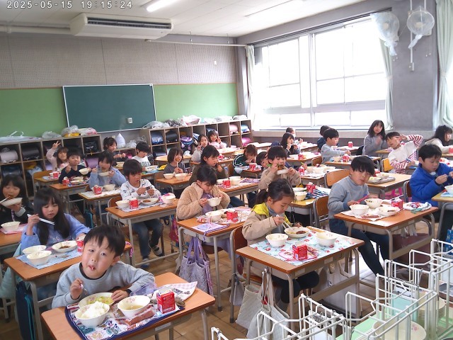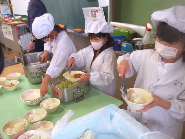 1年生も終わりに近づき、給食当番の仕事も上手にできるようになりました。給食を完食したり、おかわりをしたりする子も増えました。みんなと楽しく給食を食べて、体も心も元気よく成長しています。
