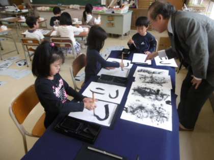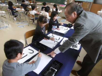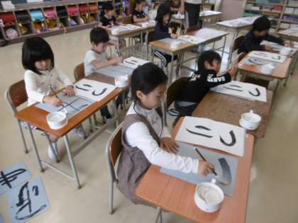 1年生の様子です。いつものように、水書板で練習をしました。そのあと、墨で実際に書いてみました。習字を習っている子もいましたが、初体験の子もいました。うまく書けたかな?