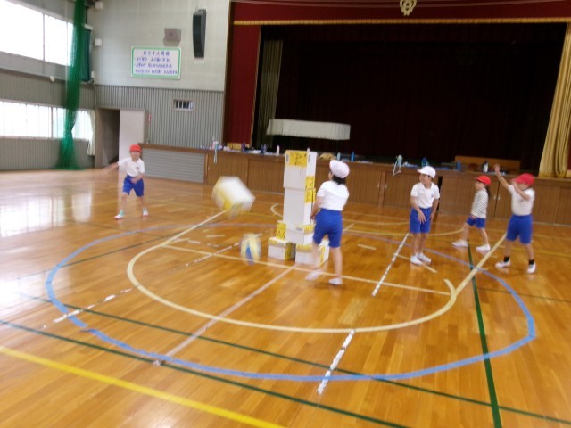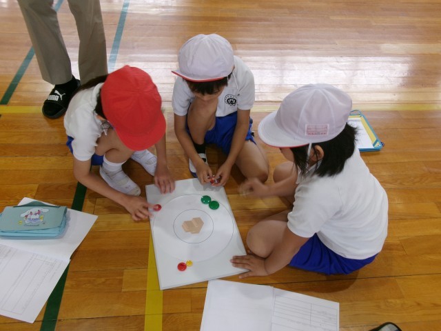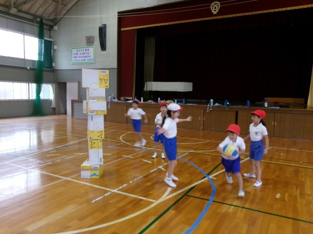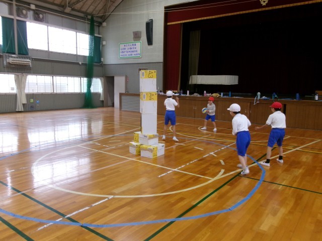 1・2年生の体育の授業で、ボールを使った的当てゲームに取り組んでいます。