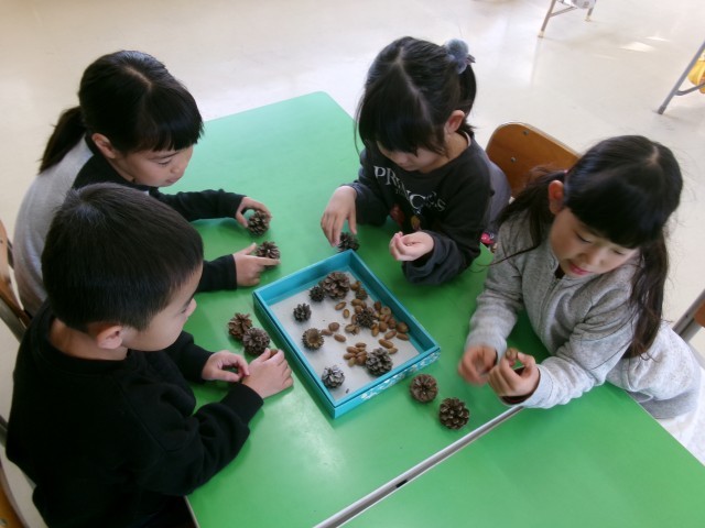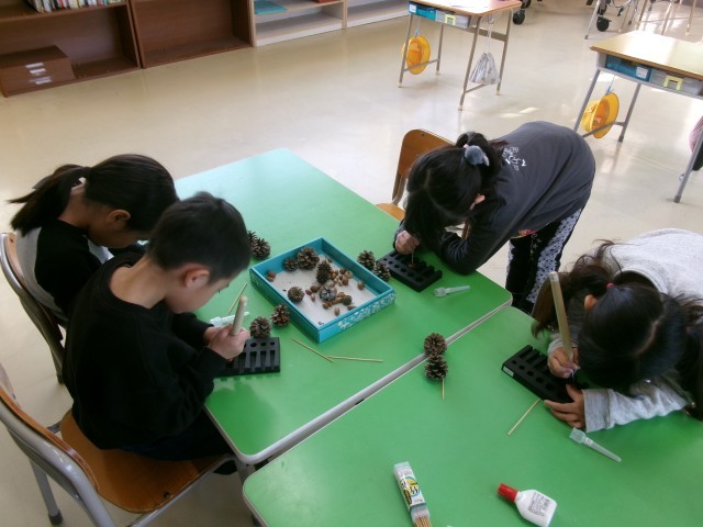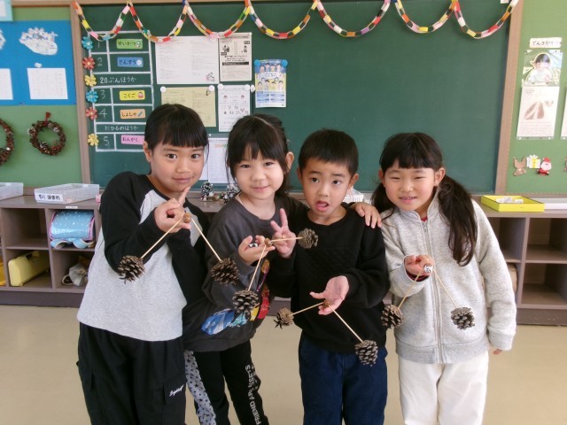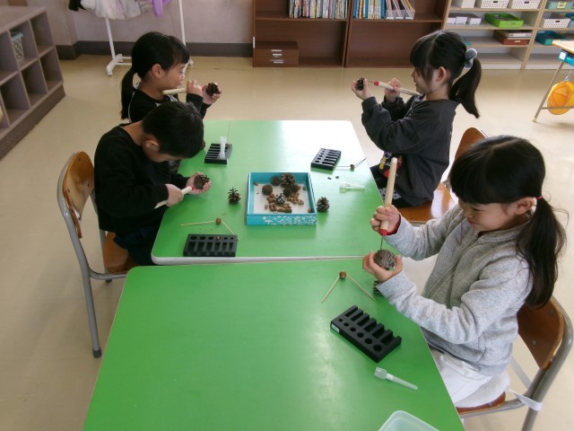 生活科で、まつぼっくりやどんぐりをつかって【やじろべえ】づくりに挑戦しました。きりを使って穴を開ける作業は少し難しく、苦戦する姿もみられましたが、あきらめずに取り組む1年生の表情はとても真剣でした。完成したやじろべえを指や鉛筆の先にそっとのせ、バランスをとることができると、「できた!」と嬉しそうな笑顔が広がりました。