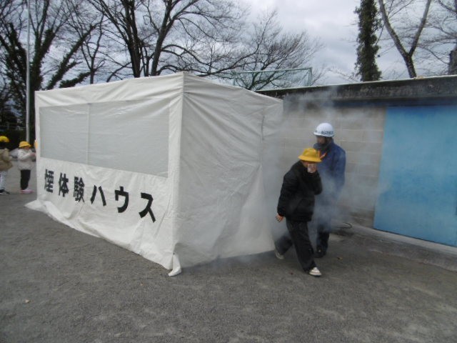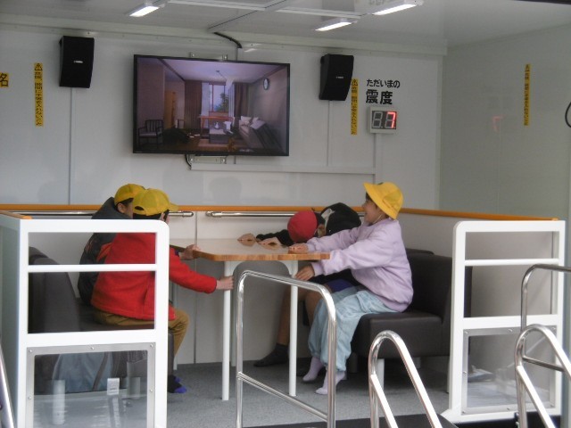 消防署の方のお話を聞いた後に、生活班に分かれて地震体験と煙道体験を行いました。
