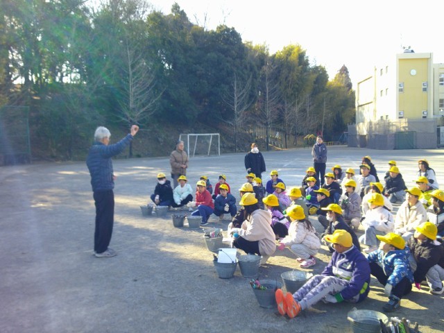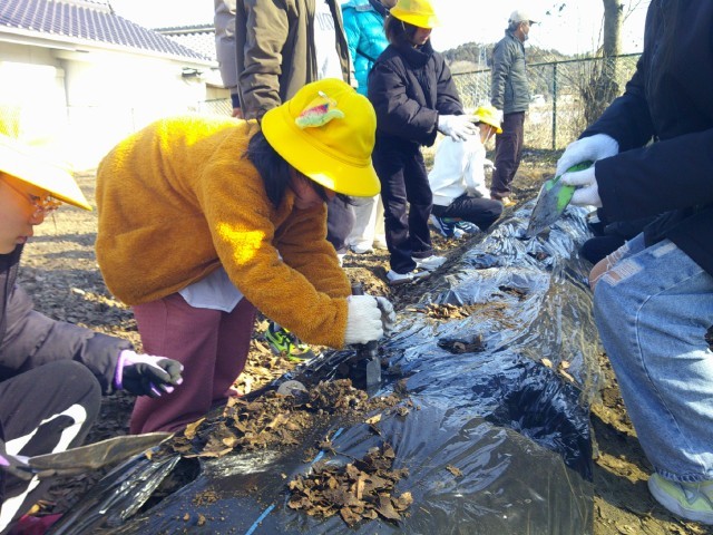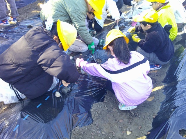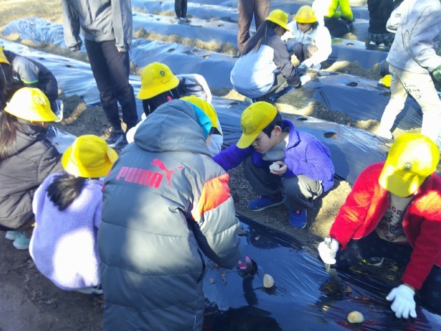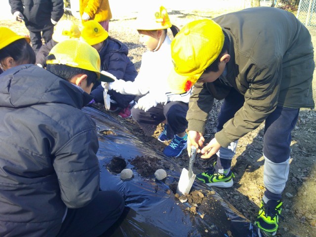 2月10日(火)の2時間目にじゃがいもの種芋を植えました。生活班で協力してそれぞれの班が一畝を担当して植えました。