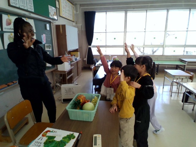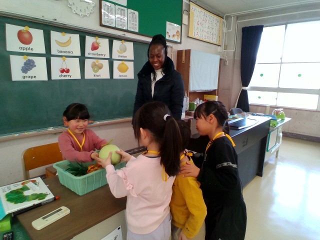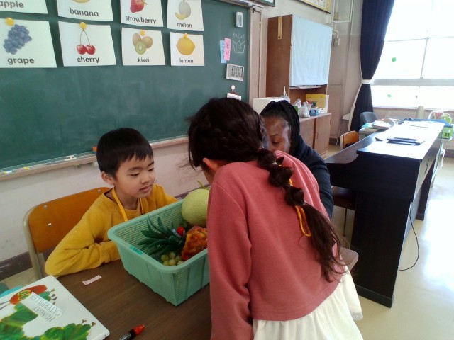 外国語の授業で、果物の名前を英語で言う学習をしました。