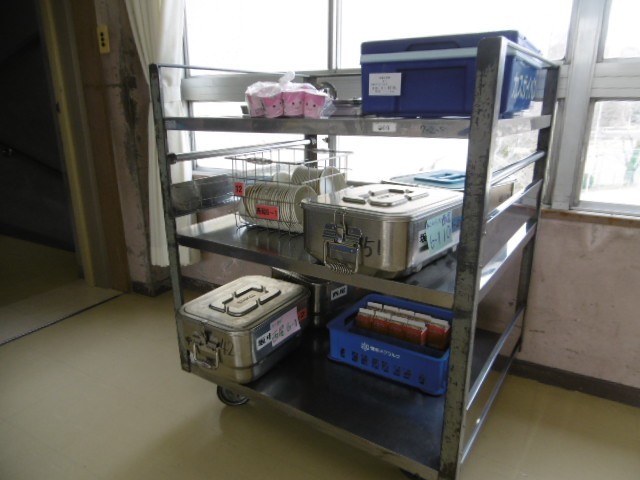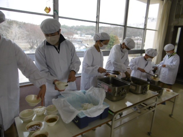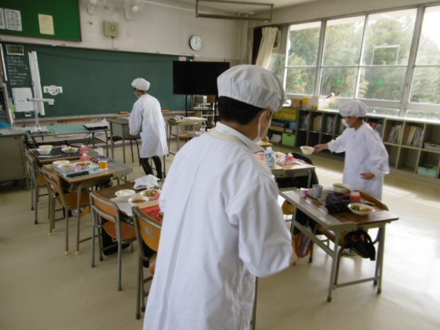 ワゴンにいつもより食缶が多くあることに気付いた6年生は「中学校の食缶が使ってある」と言いながら手際よく配膳していました。