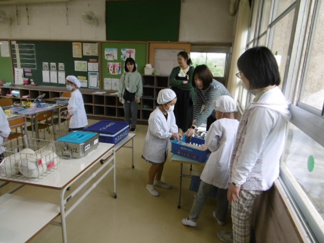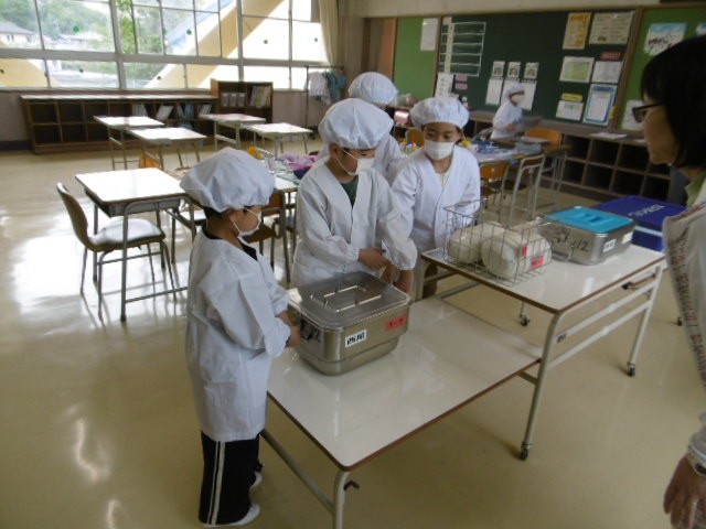 1年生は4時間目からしっかりと準備に取り掛かり、一緒に食べる2年生と一緒に配膳をしました。