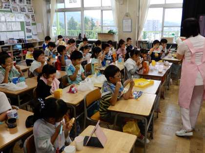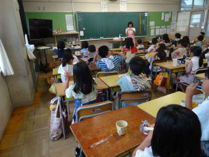 今日は歯磨き指導がありました。歯に薬を塗って、その薬が全部とれるように磨き方を教えてもらいました。磨き方のポイントを教わったことで、指導後は歯がつるつるになっている児童がたくさんいました。
