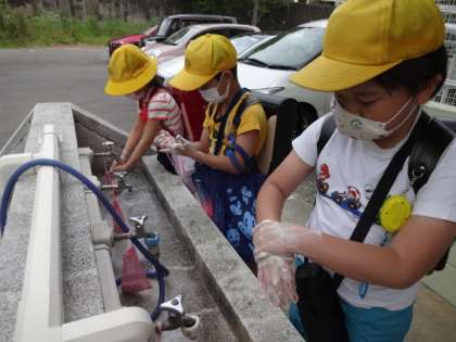登校時の手洗いがとても上手な子たちがいました。石けんをよく泡立てて丁寧に洗っていました。
