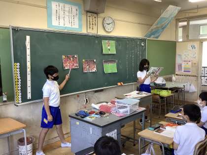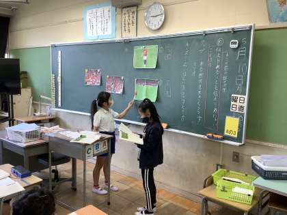 国語の「アップとルーズで伝える」の授業の様子です。文章が写真のどの部分を説明しているのかを、文章を読みながら矢印で指し示しているところです。文章と写真の対応を確認しながら読んでいくと、内容がより理解できます。アップとルーズには「伝えられること」と「伝えられないこと」があるということに気づきましたね。