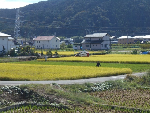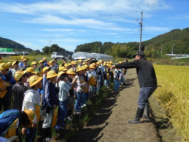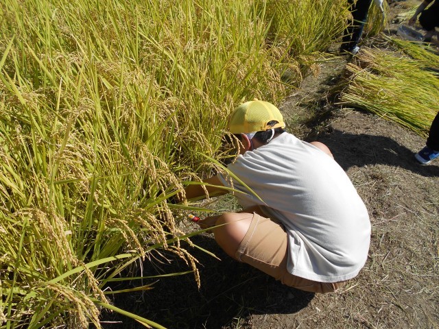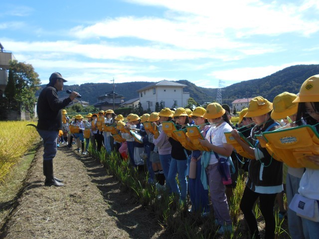 5年生は、5月に田植え見学におじゃました田んぼへ、稲刈り体験をしに出かけました。