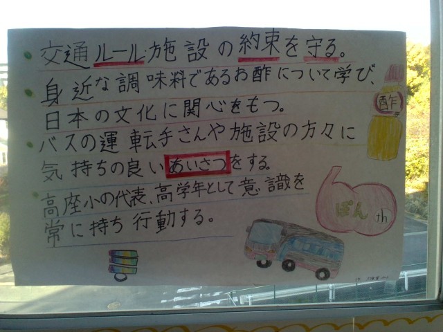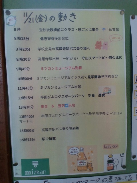 クラスの実行委員の人に、掲示物を作ってもらい、掲示しています。他の児童も事前学習としてミツカンの歴史や酢についてなど、調べ学習をして準備をしてきました。明日は、ミツカンミュージアムで酢について教えていただき、日本の食文化について学んできたいと思います。