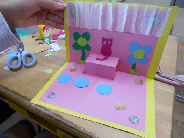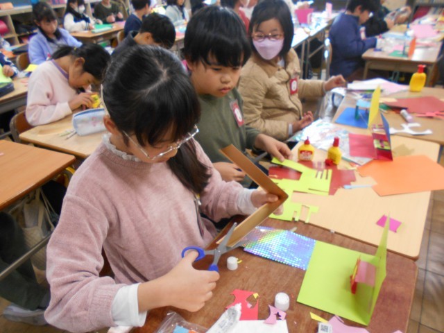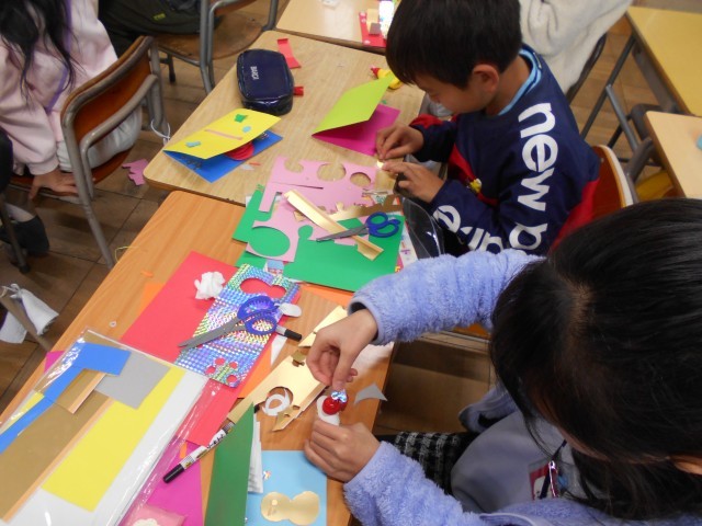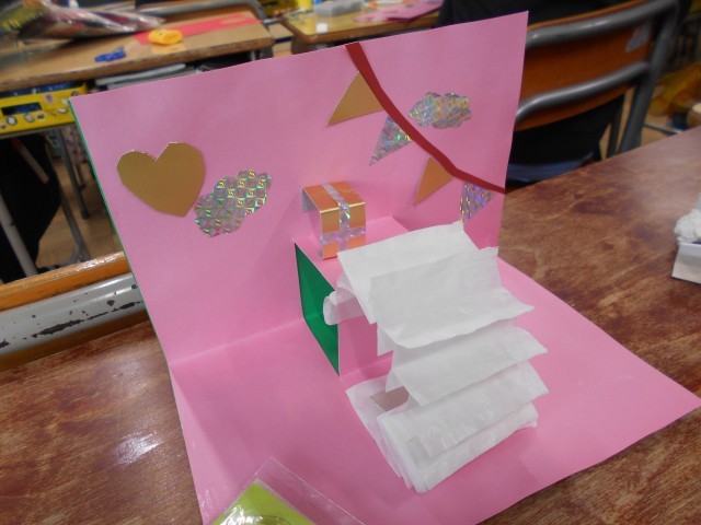 2学期最後の図工の作品作りは「幸せを運ぶカード」に取り組んでいます。開くと立体になる仕掛けを作っています。金色の工作紙は、地元の企業が寄付をしてくださいました。