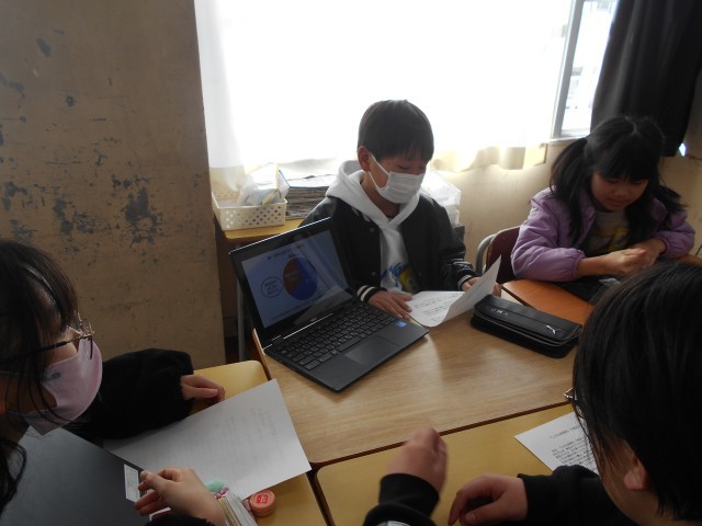 などの中から選び、資料を探してスライドに貼り付け、スライドを見せながら発表をしました。友達の発表を真剣に聞く姿が見られました。