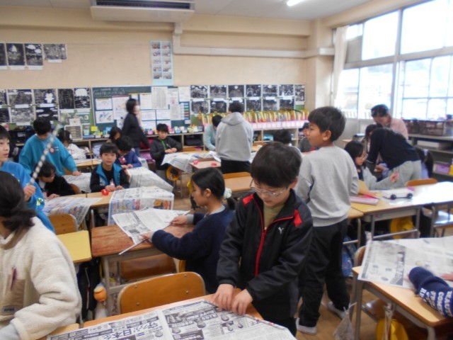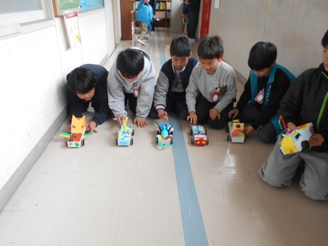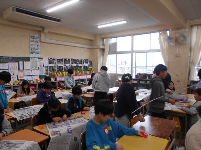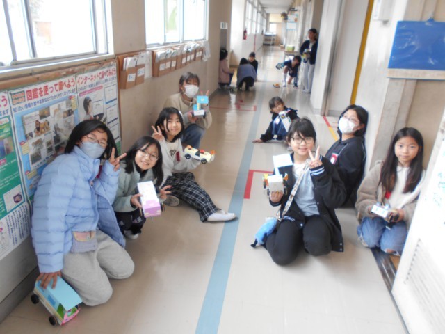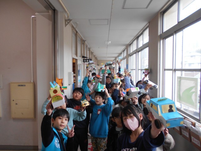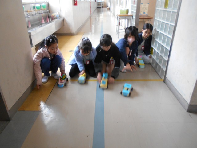 次回の図工では、新聞紙をスティック状にしたものを骨組みのように組み立てて、建造物をつくる造形遊びをします。今日は、その材料を作りました。新聞紙を細く細くまるめることができると、嬉しそうに見せてくれる子もいました。みんな黙々と作っていました。そのあとは、図工の作品の車で遊びました。廊下で自分の車を走らせて、友達と競争をしたり、誰が一番遠くまで行けるか試したり、みんな思い思いに遊んでいました。カラフルな車がたくさんで見ているだけでも楽しめました。