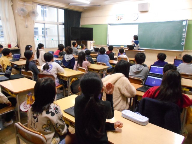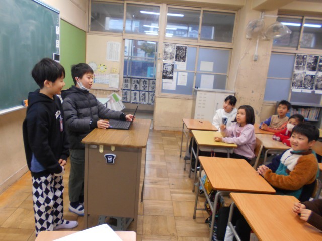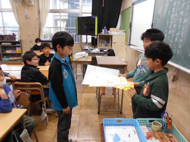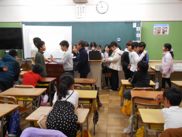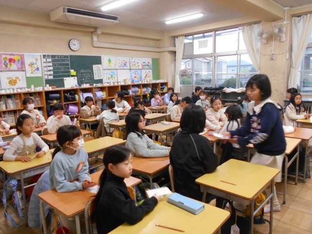 今日は、2年生と4年生の最後のなかよしタイムでした。1組は頭文字が「ありがとう」になるようなクイズ大会と伝言ゲームを行いました。2組はカフートを使ったクイズ大会を行い、最終問題には4年生の楽しかった思いが2年生に伝わるように工夫しました。3組は、いつどこゲームをして、お礼のスライドと動画を流しました。4年生になって、初めてなかよしタイムを主催する側の学年となり、どのクラスも頑張っていました。2年生から心のこもったお礼のメッセージカードをもらいました。お互いの学年の交流が深まり、よい1年のしめくくりになったと思います。