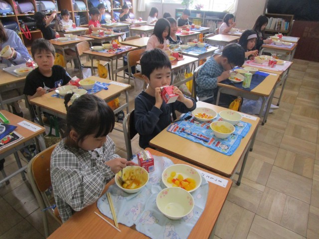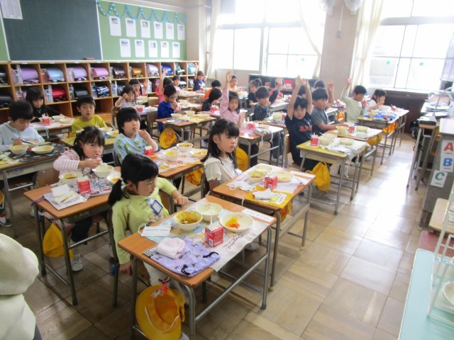 白衣の着方、配膳の仕方、ナフキンのしき方などたしかめ、静かに配膳の準備ができました。食べ方や牛乳パックの扱い方も学びました。子どもたちはとても美味しそうに笑顔で食べていました。