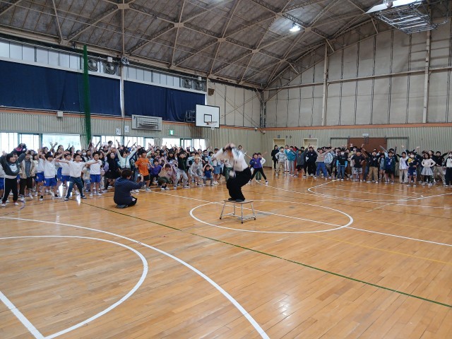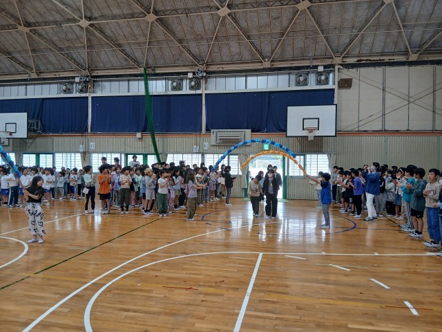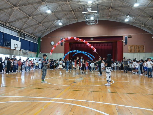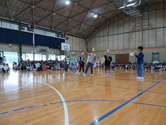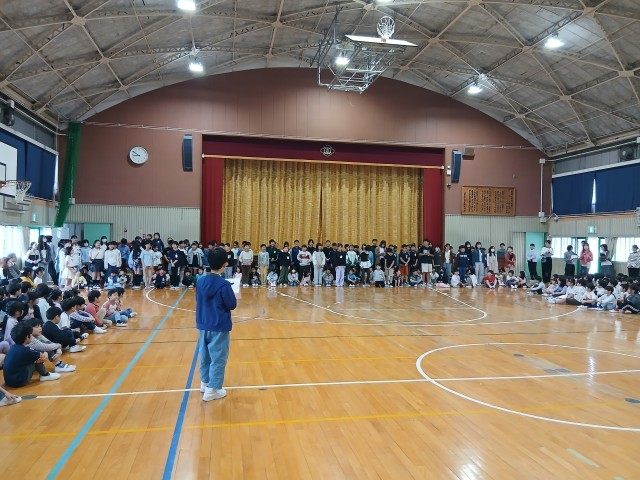 学年紹介や校歌斉唱に続き、児童会による「からだでじゃんけん」大会では、先生や校長先生との対戦に会場は大いに盛り上がりました。