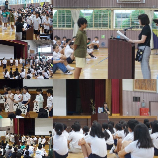 今日は朝会がありました。体育館には5・6年生が入り、とても静かに待つことができていました。さすが高学年です!朝会では後期学級委員の認証や席上揮毫大会に参加する選手のみなさんからのあいさつ、表彰がありました。校長先生から秋の七草についてのお話を聞き、春の七草との違いを知り驚いた子も多かったようです。