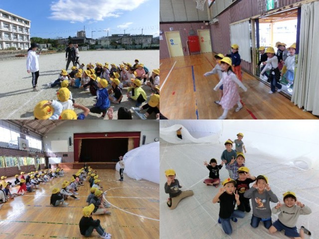 1年生、国語で勉強した「くじらぐも」の特別授業がありました。運動場でよく晴れた空を見上げ、くじらぐものセリフを声をそろえて言いました。そのあと、体育館で大きなくじらぐもとご対面です。ふわふわの大きなくじらにみんな大興奮でした。