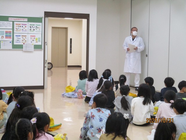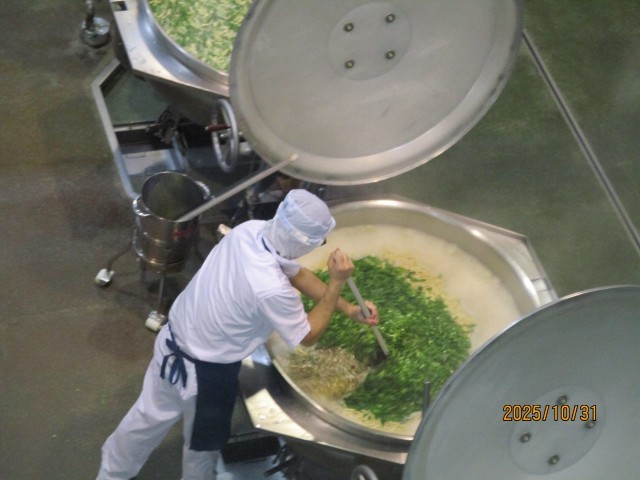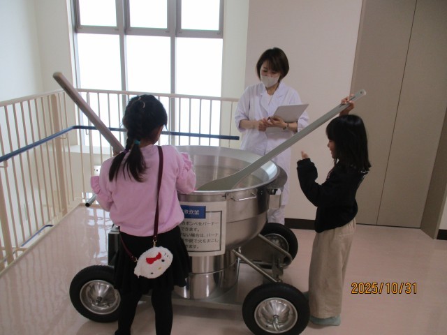 調理場では、今日の給食メニューの「五目うどんの汁」を作る様子を見学しました。大きなお釜で作られるたくさんの給食に見入っていました。