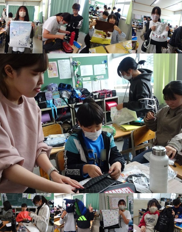 家庭科のナップザック作り、完成した子がいました。