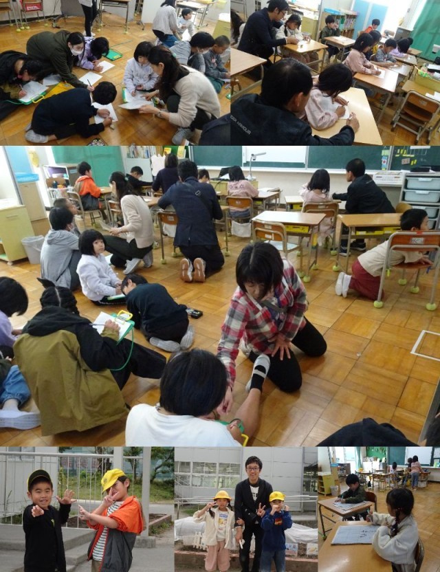 1年生は算数、2年生は音楽と体育、なかよしさんはブロック交流会の説明を聞いています。