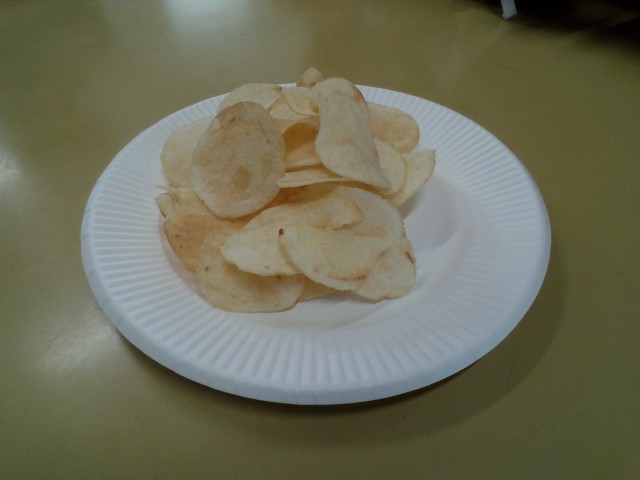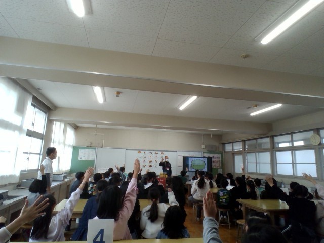 講師の方に来て頂き、カルビースナック出前授業を行いました。普段食べるポテトチップスの量を調べるゲームをしました。その他に、原料から手元に届くまでにどんな人が関わっているかやパッケージ表示の見方、おやつを食べるときの注意点について学びました。