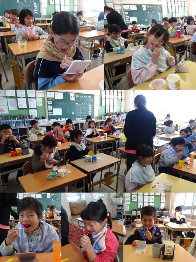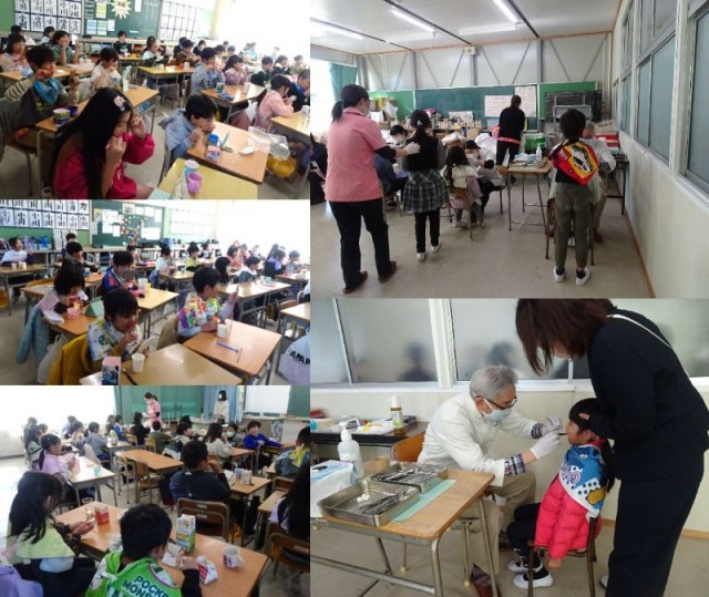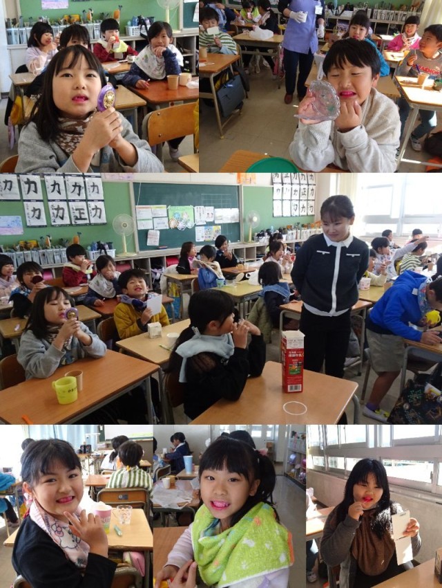 歯磨き指導、フッ素塗布がありました。染め出し錠を使ってピンク色になった歯を見てびっくり!