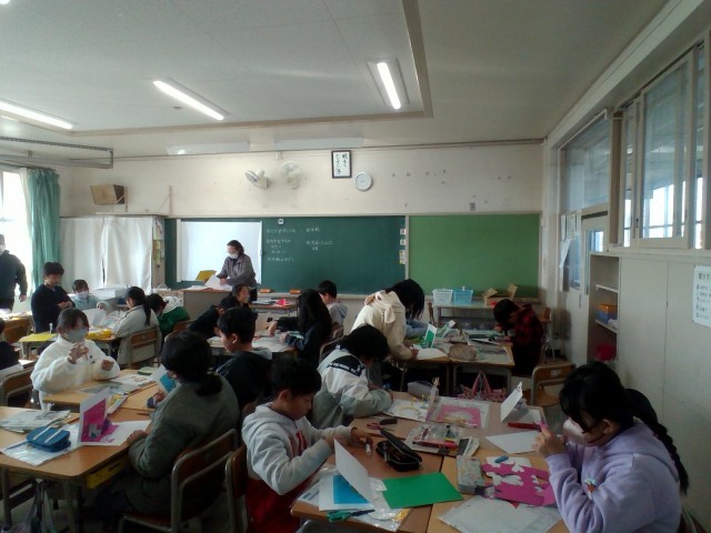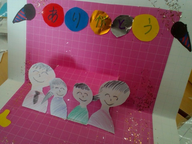 図工で、飛び出すカードを作っています。カードを渡す相手を想像しながら楽しく取り組みました。最初に掲載した画像は、先日の校外学習で見学に行った、木曽三川公園センターの職員の方から頂いた飛び出すカードです。