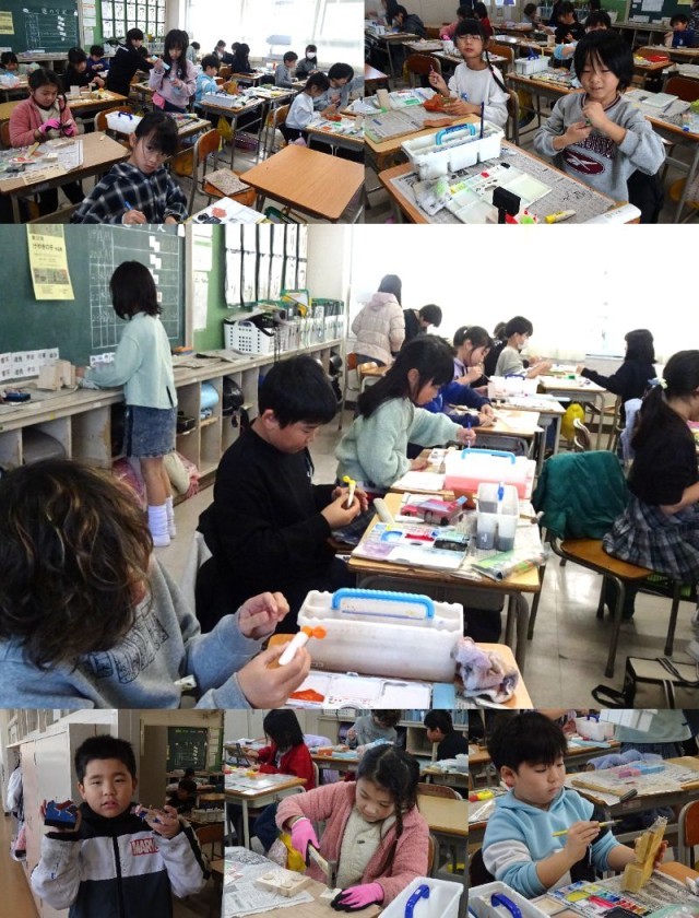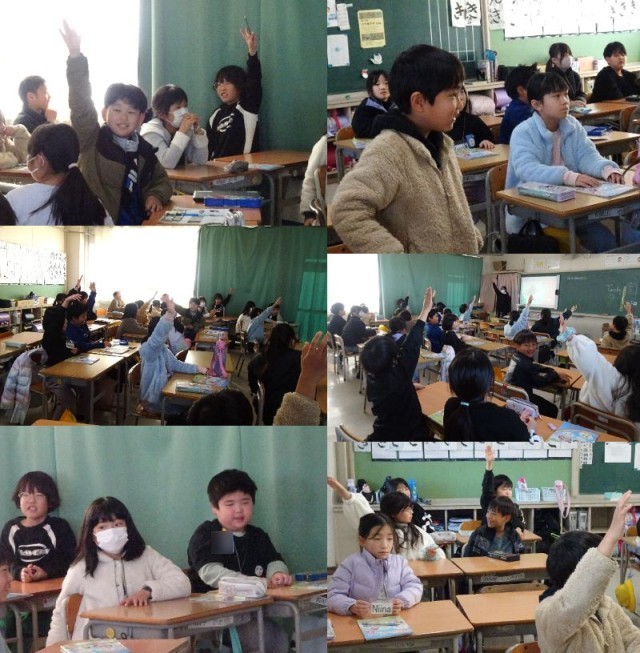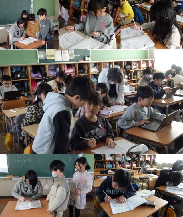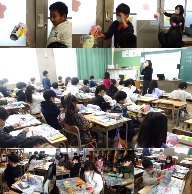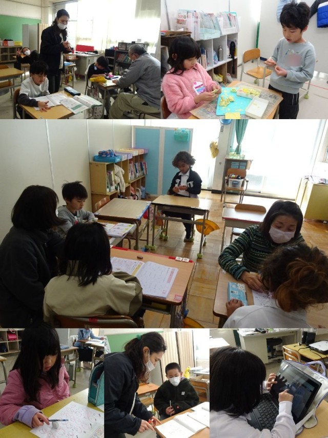 3年生は図工と外国語。なかよしさんは1人で取り組んだりみんなで勉強したりしています。