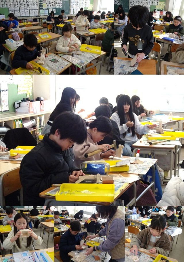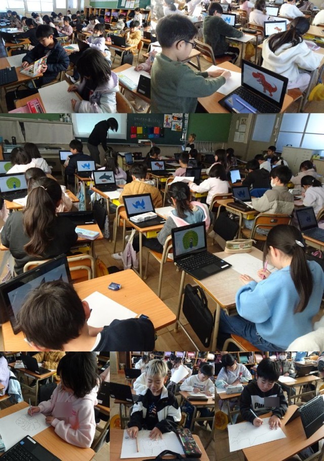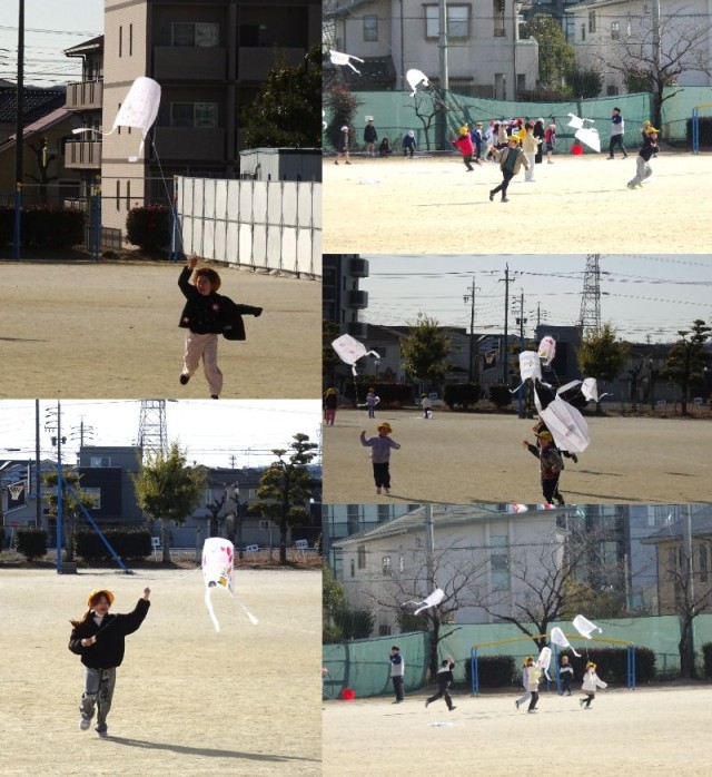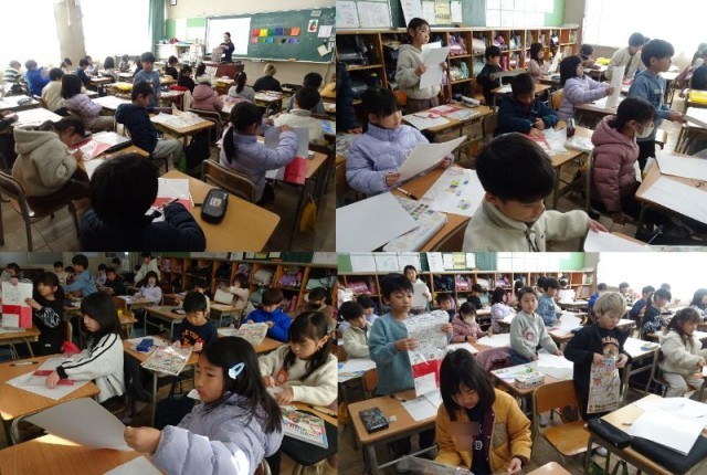 1年生はたこあげ、2年生は図工、3年生は国語と図工の様子です。